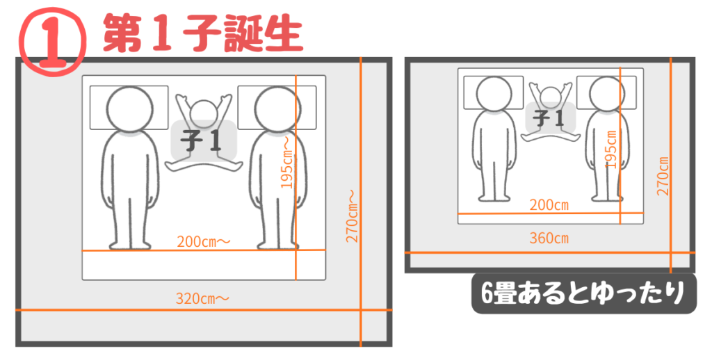 第1子が誕生すると最初のうちはベビーベッドが安全ですが3人で川の字に寝るようになるかと思います。3人で寝る場合6畳程度のお部屋があると安心ですね!