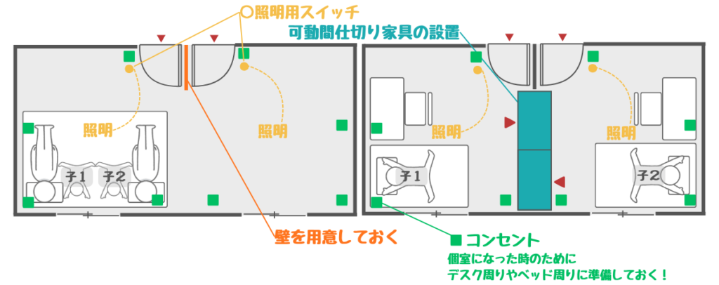 特にコンセントやスイッチの位置は新築時に準備しておく必要があるので部屋を分けた後のことをしっかり考えて準備しましょう