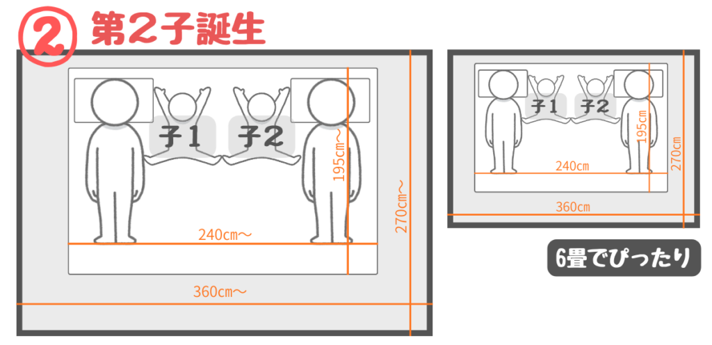 第2子が誕生すると4人で寝るスペースが必要になり、6畳の部屋に布団を引いてぎりぎりというサイズ感になります