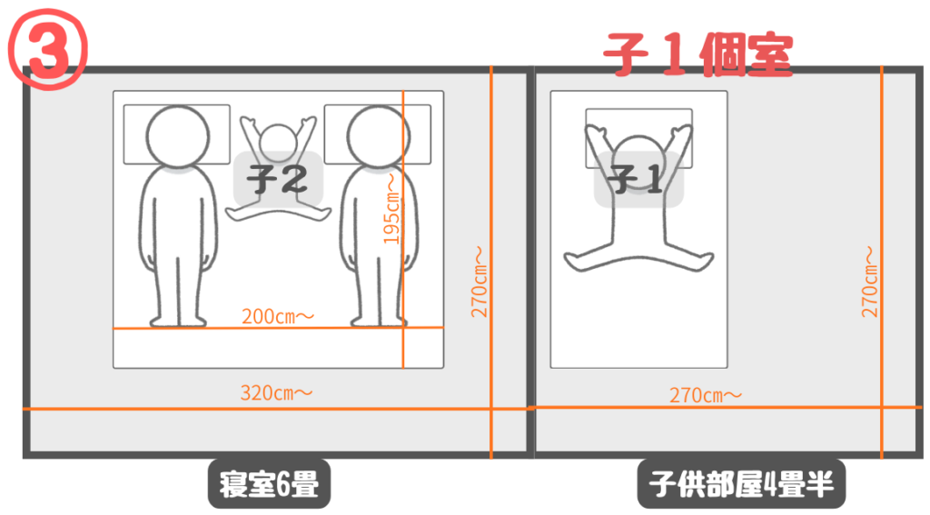 ③第1子が個室で寝る:大人2人+子2=幅200㎝~、子1=個室4畳半➡寝室+子供部屋1