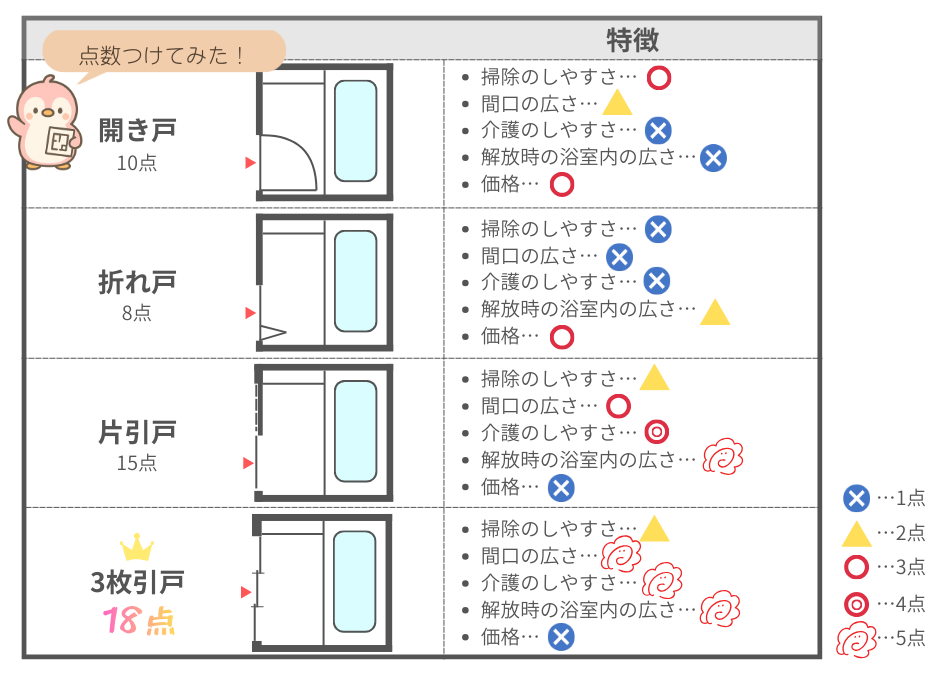介護をする機会がある・浴室が狭い(1坪未満)場合はお掃除の手間がかかっても片開き戸以外の扉にすることをおすすめします!