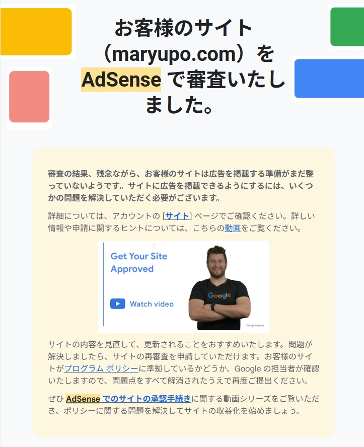 Googleから速攻審査落ちのメールが?!