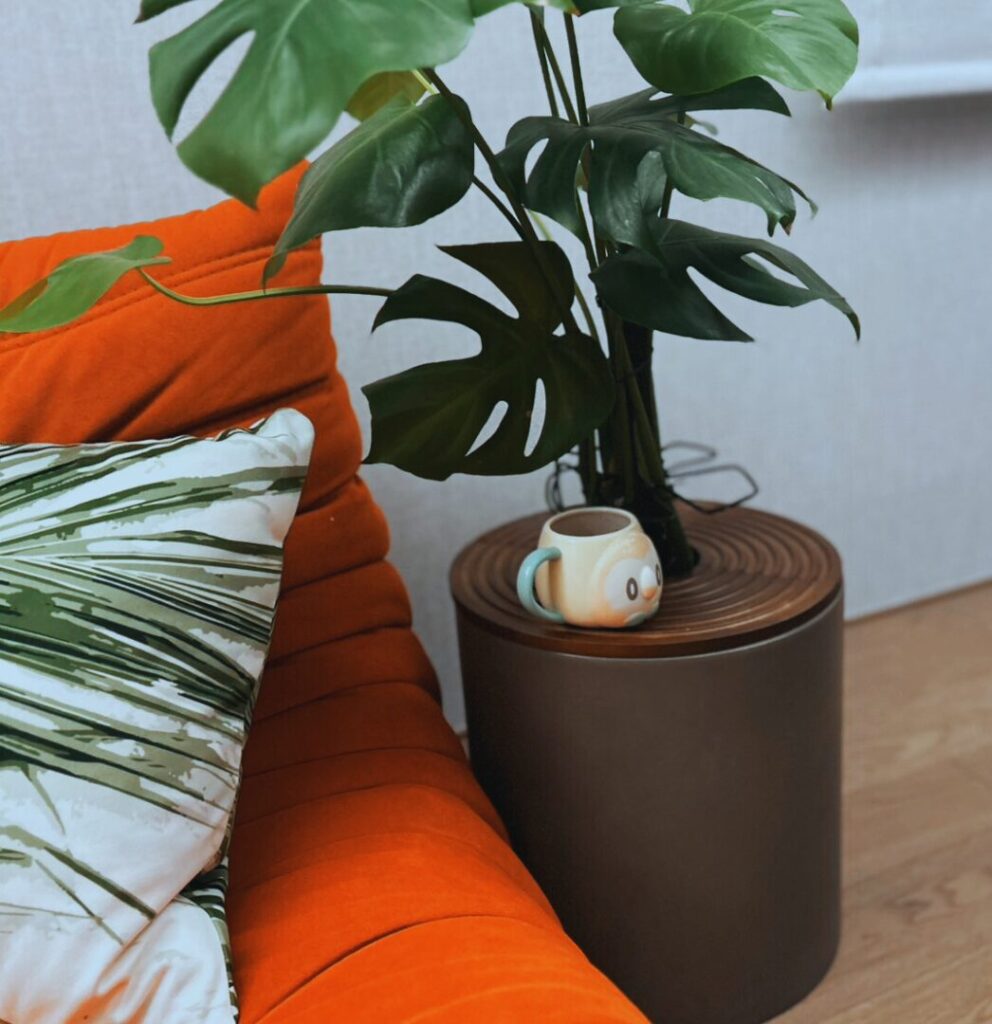 リビングのソファの横にモンステラがあり、そこにプランツテーブルを置くことでマグカップが置けるようになりました!