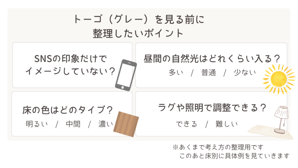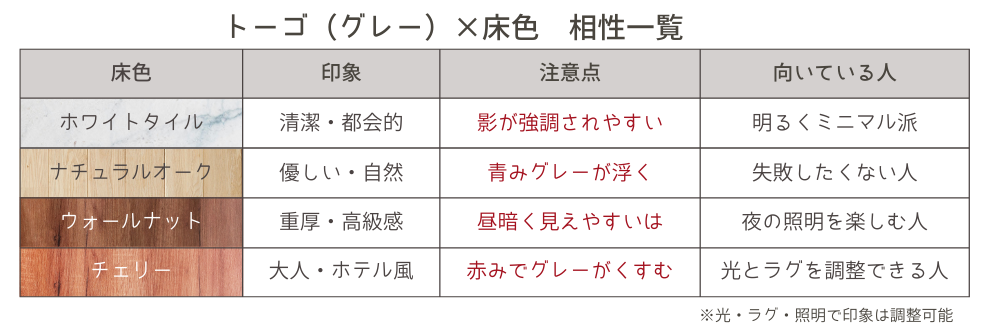 トーゴのグレーは、床色と光を外すと後悔しやすい一方、
